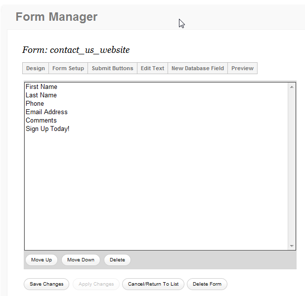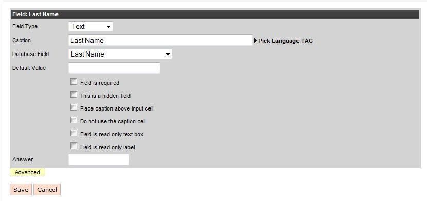 OverviewWhen you navigate to a page that has a form on it, either in the administration area or the web site, if you have form edit access, you'll see a yellow pencil in the bottom right corner of the form: Field TypeThis is the type of field you'd like to use. A text field, numeric, date etc. CaptionThe caption of the field. Database FieldThis is the database field the element related to. Default ValueOptionally, you can specify a default value Other OptionsThe other checkbox options allow you to further customize the field |